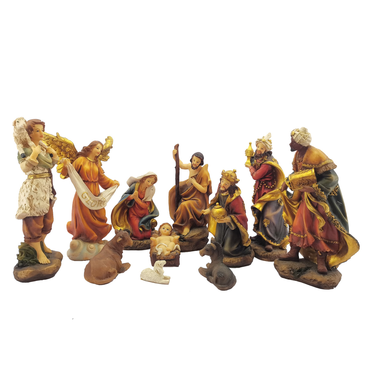 Figures include Joseph,Mary,baby Jesus,Shepherds,Angel,The Three Kings ,Cow,Sheep and Donkey.