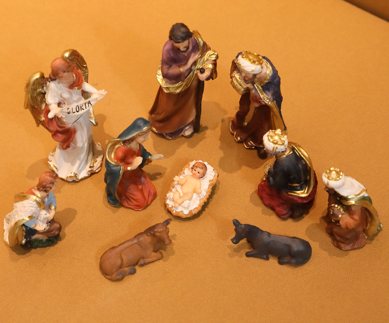 Figures include Joseph, Mary, baby Jesus, Shepherds, Angel, The Three Kings, Cow, Sheep, and Donkey.